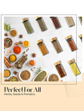 Spice jars are made of food-grade high borosilicate glass, lead-free and non-toxic. The airtight bamboo lid seals well with an all-around silicone, creating a moisture-proof environment to keep your spices clean and fresh. A complete 12-jar glass spice storage set with airtight bamboo lids, shaker inserts, labels, and accessories for stylish, fresh, and organized kitchen storage.